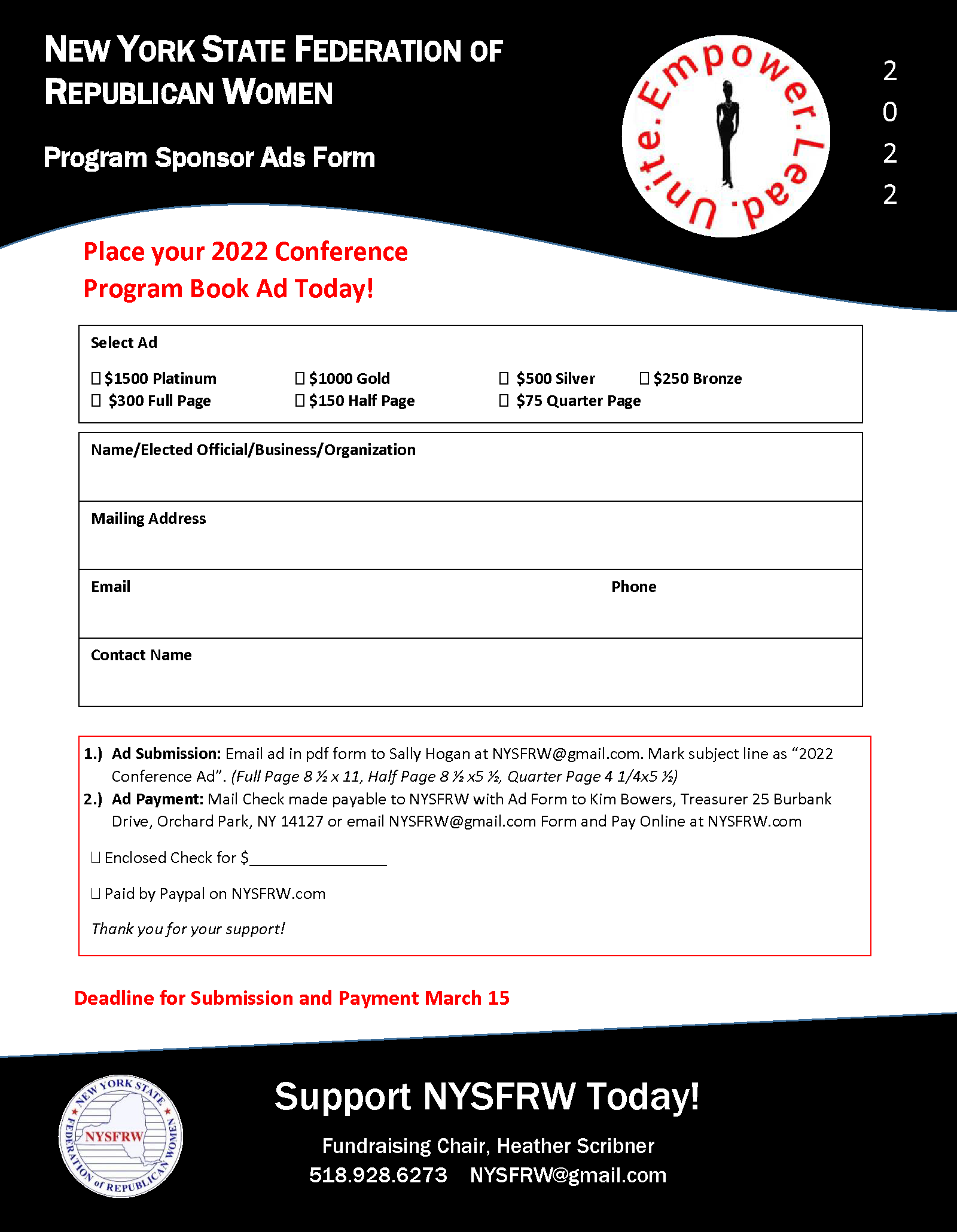 Ad Payment: Mail check made payable to NYSFRW with Ad Form to:
